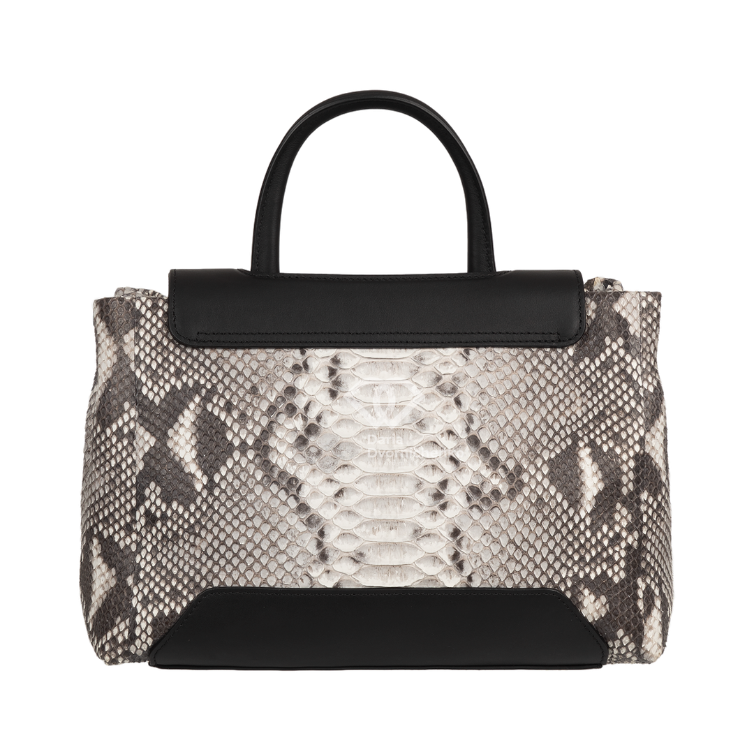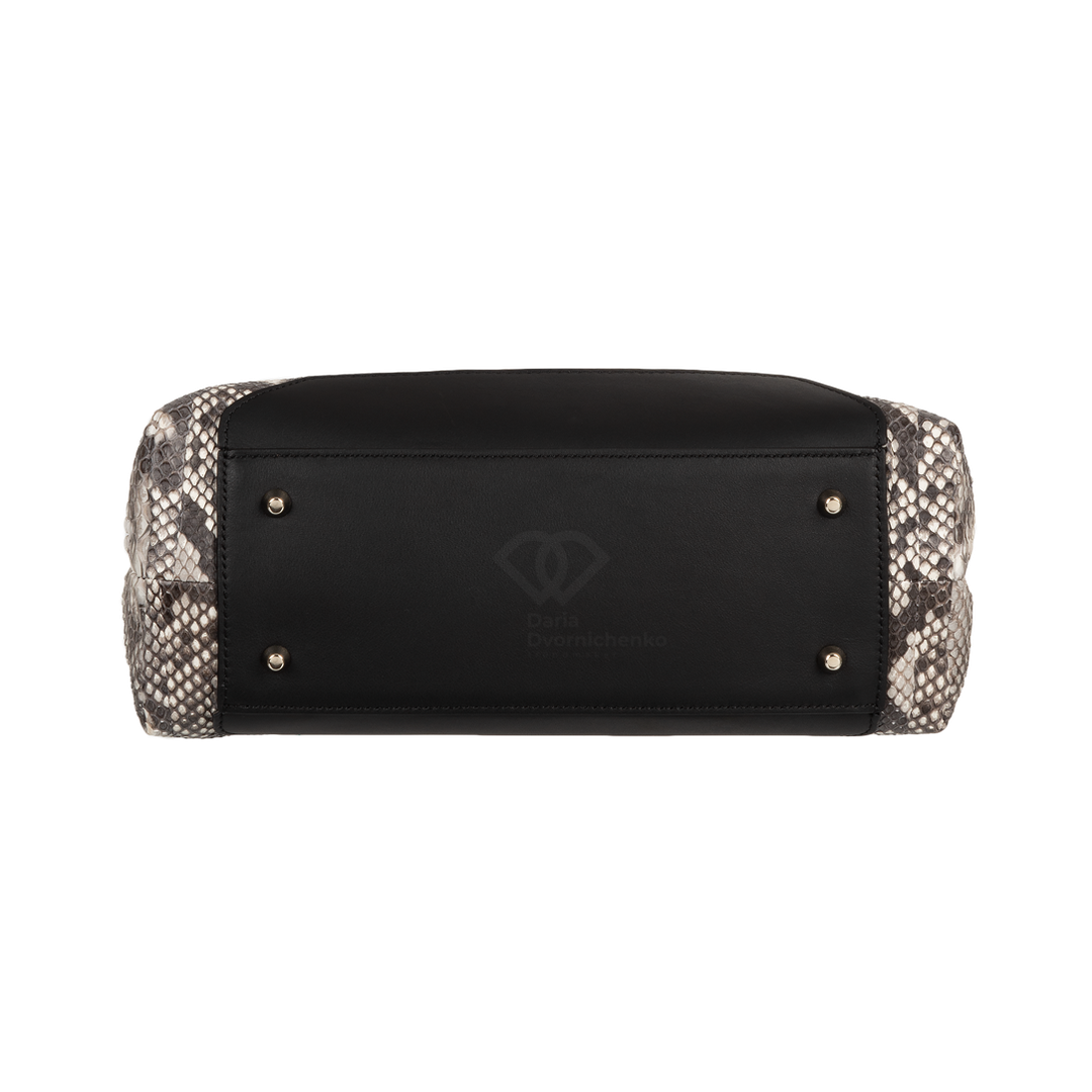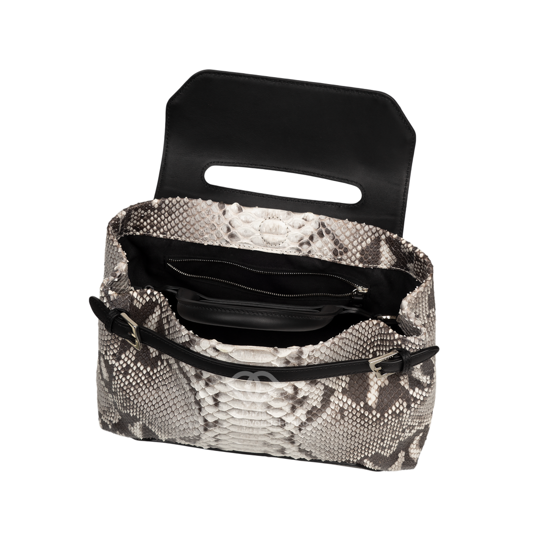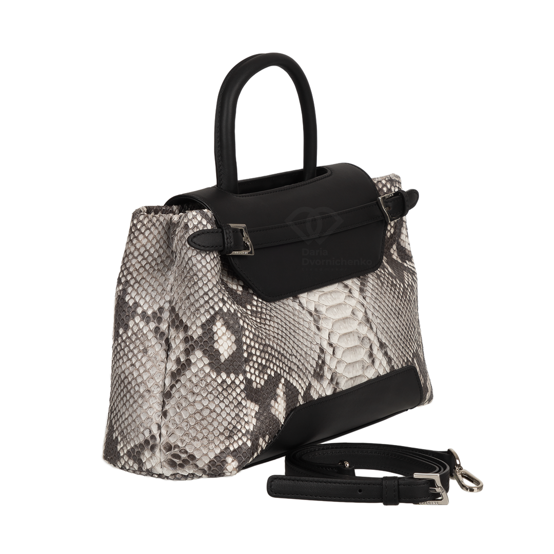 Особенностью модели является комбинирование натуральной кожи питона основного корпуса с вставками из гладкой кожи на клапане и верхней части ручки, что придает изделию роскошный и дорогой вид. Невероятная износостойкость питона с годами выглядит только благороднее. Сумка оснащена удобной верхней ручкой, а также имеет элегантные ремешки с металлическими пряжками по бокам. Клапан закрывается на скрытую магнитную кнопку, обеспечивая легкий доступ и надежное хранение содержимого. Внутри сумка отделана замшевой подкладкой и имеет несколько отделений, включая карманы на молнии для ценных вещей и открытые карманы для мелочей, что обеспечивает прекрасную организацию пространства.